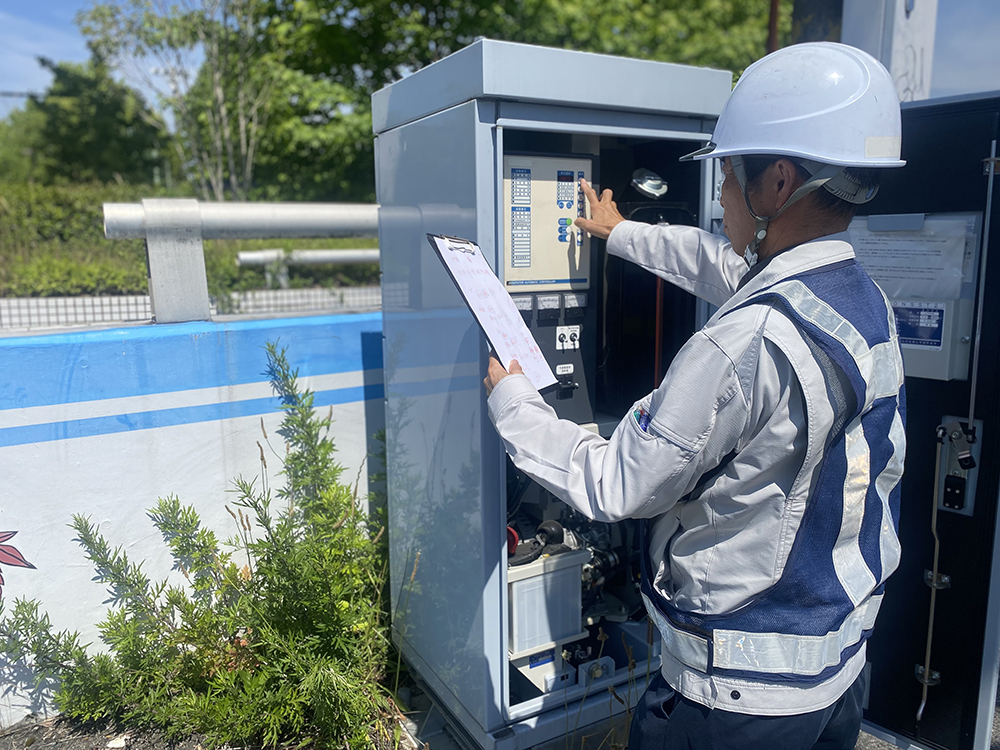 停電時に自動で起動する電源付加装置(発電機)の保守点検を行っています。安定した電源供給を確保するため、定期的に発電機の燃料やオイルの交換・補充を実施し、各部の動作確認や清掃も行います。